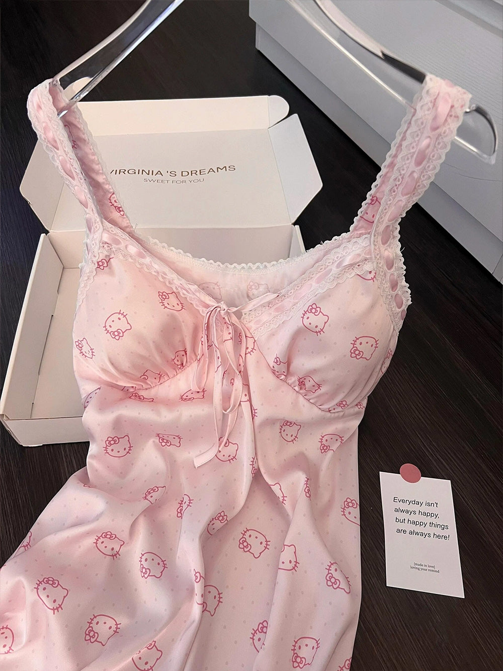 Hello Kitty Printed Ice Silk Pajamas | Nightgown with padded straps